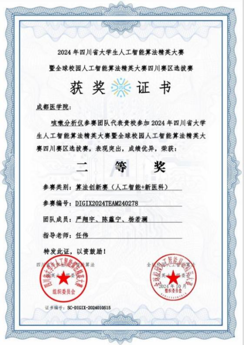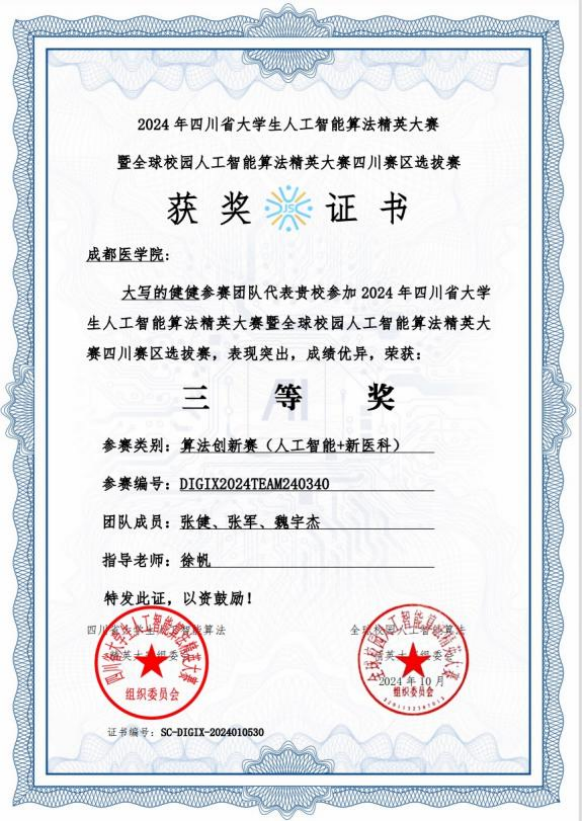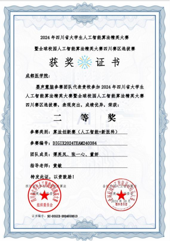 这些成绩的取得,离不开参赛同学们平日里的刻苦钻研与辛勤付出,更离不开学校相关专业老师的悉心指导与大力支持。此次大赛不仅为成都医学院热爱人工智能算法的学子们提供了一个展示自我的平台,也进一步提升了学校在人工智能领域的影响力。