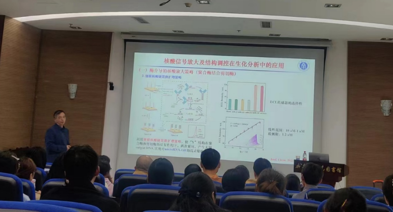 11月7日下午,袁若教授首先做了题为“核酸信号放大及结构调控在生化分析中的应用”的专题讲座,介绍了多种创新的核酸信号放大技术,能够在较短的时间内将微弱的核酸信号放大到可检测的水平,实现目标物高特异性和选择性检测。此外,袁教授还介绍了DNA纳米结构调控在生化分析中的应用,开拓了老师和同学们的科研思路。讲座结束后,袁教授与在场师生就具体研究问题和研究思路进行了深入的沟通交流。