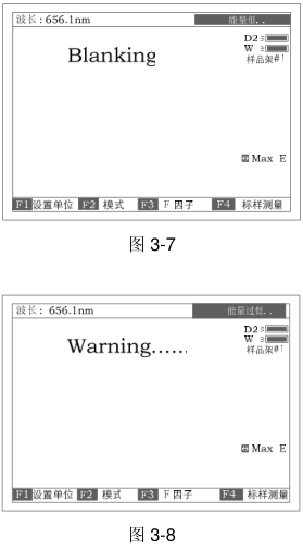 5.5 如果参比液太浓,将在屏幕的右上角显示“能量不足......”(图3-7);如果在屏幕的右上角显示的“能量过低......”,试验将会终止,告警符“Warning...”将显示在屏幕中央(图3-8)