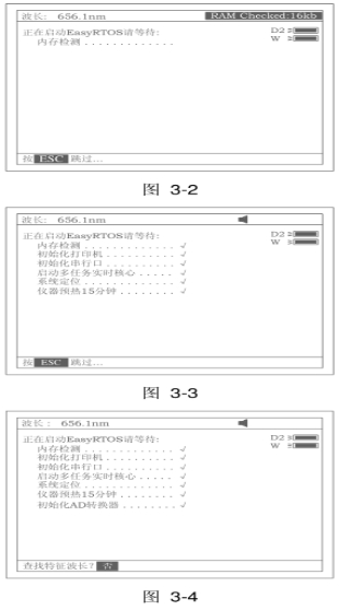 5.1 上电后, 仪器会自动自检并初始化,首先检查内存 (图 3-2),按任意键可跳过这一步,待初始化完成后,仪器将预热 15分钟 (图 3-3) ,15 分钟到或按【ESC/STOP】跳过到图3-4 ,屏幕最底行会显示:重新校刻系统 重新校刻系统?否 。