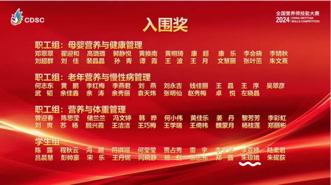 2024年10月17-19日,2024年全国营养师技能大赛全国总决赛在北京圆满落幕。学校公共卫生学院2022级研究生朱琼娥,作为四川省学生组唯一的晋级选手,荣获入围奖。